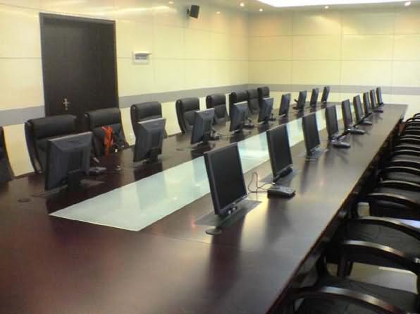 當需要舉行會議時隱藏在會議桌內的升降器把液晶顯示器從會議桌下面自動升到桌面并仰成一定角度,